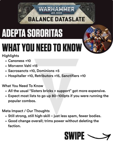 Empecemos viendo los cambios de las Hermanas de Batalla y para ello tenemos imágenes con los resumentes de cada facción (en inglés).