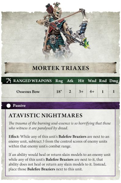 Por cada 10 Triaxes Mortek de una unidad, se acompañan de dos Braseros de Fuego Atroz de tres patas. Si todos los disparos de los Triaxes impactan contra la misma unidad, pueden colocar una ficha de Brasero de Fuego Atroz junto a ella para indicar el trauma de la esencia de alma ardiente que envuelve sus flechas. Esta llama etérea y desgarradora provoca Pesadillas Atávicas en sus objetivos , lo que reduce su control en 3. Este efecto también se propaga a los enemigos a 3″ o menos de ellos. Solo las habilidades de curación pueden extinguir las llamas, a expensas de la curación de la unidad o del regreso de las miniaturas muertas.