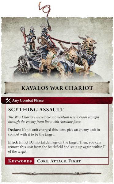 Los Carros de Guerra están diseñados para realizar un Asalto Guadaña , infligiendo daño al cargar contra unidades enemigas, a la vez que destrozan las líneas defensivas (representado por la retirada de la miniatura y el despliegue de nuevo en combate).