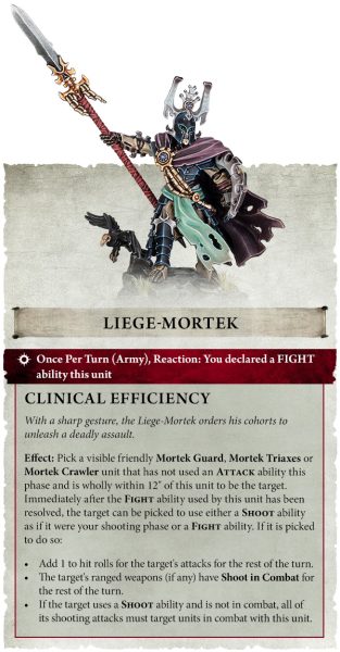 Con Eficiencia Clínica , pueden ordenar a otra unidad Mortek que luche tras ellos, sumando 1 a cualquier tirada para impactar. Esta habilidad permite a los Triaxes Mortek y a los Reptadores Mortek elegir Disparar en lugar de Luchar, y otorga a sus armas a distancia la regla de Disparar en Combate.