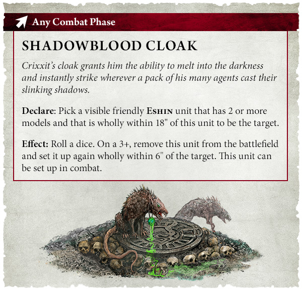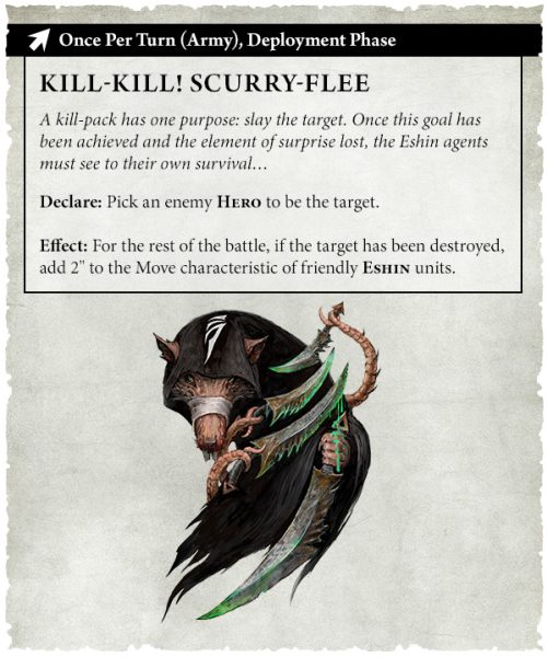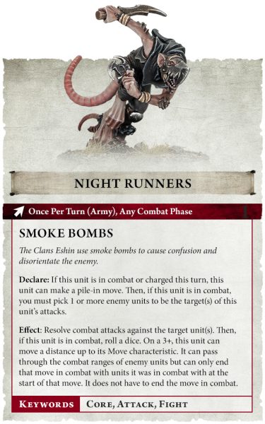 El libro de ejército de los Skaven incluye cuatro formaciones de batalla que representan los distintos estilos de lucha de los clanes Skryre, Moulder, Pestilens y Verminus. Ahora, los clanes Eshin se suman a la acción con la formación de batalla de «manada de muerte»: simplemente elige tu objetivo y, una vez eliminado, huye lo más rápido posible.
