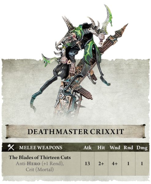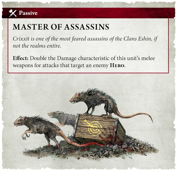 Incluso tu Señor de las Alimañas Engañador agradecerá dos pulgadas adicionales de movimiento. La forma más fácil de derribar a un Héroe enemigo es con el infame Maestro de la Muerte Crixxit. Abundan las leyendas en los Reinos Mortales sobre los objetivos que ha eliminado, y es uno de los pocos asesinos Skaven que revela voluntariamente su identidad.