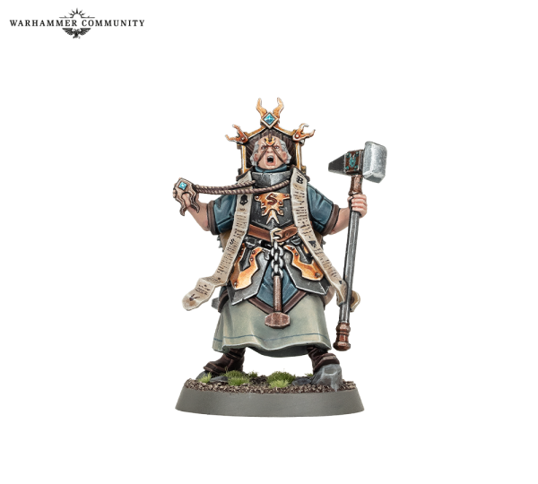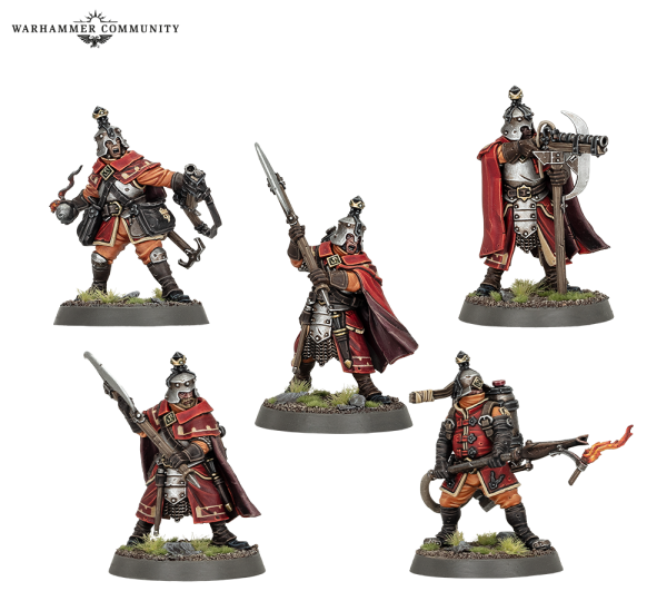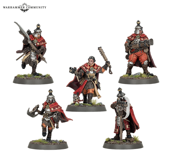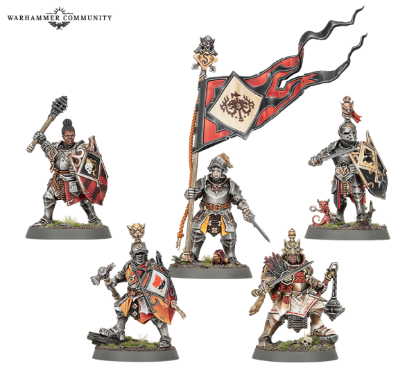Con él marcha una banda de valientes Gallants de la Freeguild que se ciñen pesadas armaduras y escudos para mantener el terreno hasta su último aliento, una unidad de granaderos de élite de la Freeguild equipados para el combate cuerpo a cuerpo con potentes armas de fuego y pesadas bardiches, y un devoto Sacerdote Forjador de Mallus cuyos inspiradores sermones consagran la tierra corrompida.
