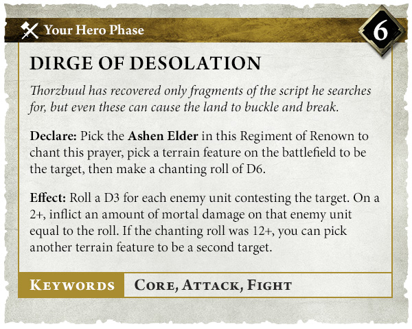 Con un resultado de 6+ en el canto, puedes elegir un accidente geográfico como objetivo, tirar un D3 por cada unidad que lo dispute e infligir daño mortal igual al resultado de la tirada con un 2+. Con un resultado de 12+ en el canto, se puede elegir un segundo accidente geográfico para una devastación adicional.