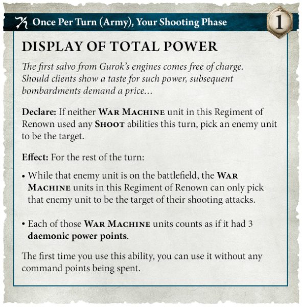 Esta Demostración de Poder Total se puede usar gratis la primera vez, pero requiere un punto de mando para cada uso posterior. Un coste razonable, ya que permite que ambas máquinas de guerra actúen como si tuvieran tres puntos de poder demoníaco cada una, siempre que ambas ataquen a la misma unidad.