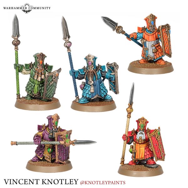 Como vemos el metal y colores metálicos en general debe ser un referente y un punto fuerte y luego ya te toca a ti elegir el resto de colores que tendrá el resto de la armadura, las armas y las energias místicas que tiene este ejército.