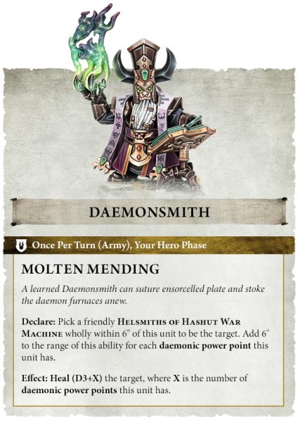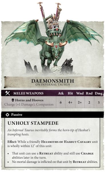 Al igual que la Cohorte Infernal, los Herreros Demonios se benefician de la Resiliencia Demoníaca cuando se les asignan puntos de poder demoníaco , y las formas artesanales de sus monturas a menudo lideran una Estampida Impía de Centauros Toro, otorgando Retirada y Carga a toda la caballería cercana.