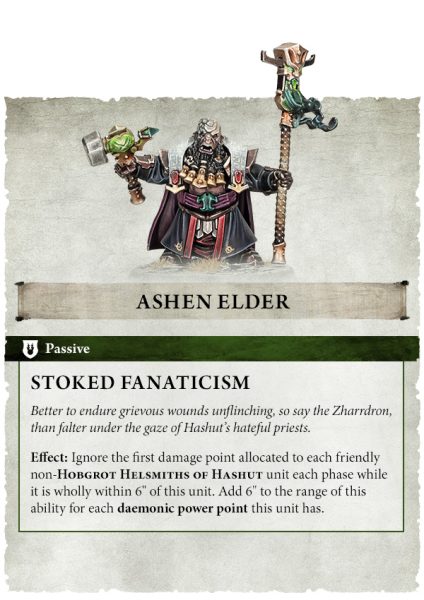 Los Ancianos Cenizos, por su parte, son venerables predicadores que mantienen una feroz rivalidad con los hechiceros de los Herreros del Infierno. Su Fanatismo Insaciable permite a las unidades aliadas ignorar un punto de Daño: es mejor sufrir las heridas del combate que quedar marcado como un cobarde ante prelados tan desdeñosos.