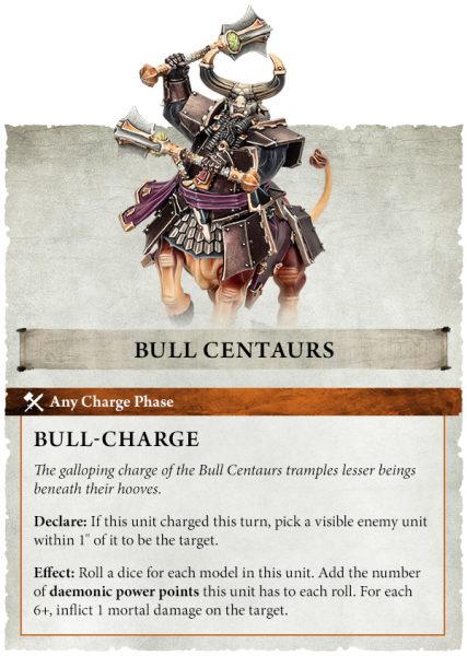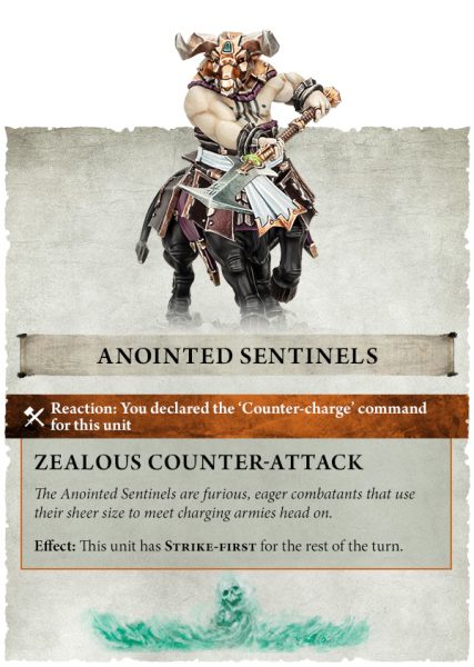 La Carga de Toro de los Centauros Toro se lanza al combate con temerario desenfreno, infligiendo daño mortal cuya potencia aumenta con su poder demoníaco. Los Centinelas Ungidos son los guardianes del templo más reservados, que pueden, en cambio, atacar primero en combate con un Contraataque Celoso .