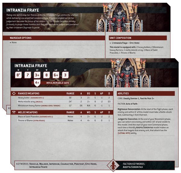 Que sus justas denuncias por sí solas hagan que los enemigos se acobarden ante ella no debería sorprender, ya que ha ascendido a la cima de una orden dedicada a juzgar severamente a los indignos. Incluso puede decretar que la unidad de un oponente sea condenada a muerte , lo que provoca que sus compañeras hermanas redoblen su furia y ataquen con suprema convicción.