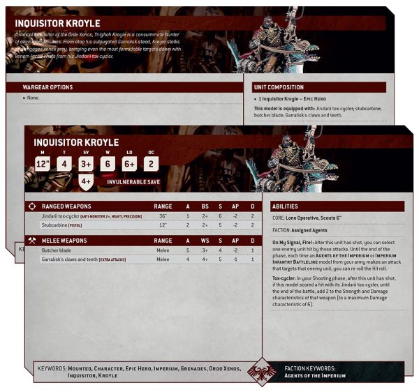 El Inquisidor Kroyle solo piensa en una cosa: la caza. ¿Orkos por todo Armageddon? Esperemos que hayan traído buenos líderes para la sala de trofeos. Su ágil movimiento de 12 pulgadas y la regla de Operativo Solitario le permiten evitar combates que no sean en sus términos, mientras que el impresionante alcance de 36 pulgadas de su extraño rifle xeno lo mantiene a salvo.
