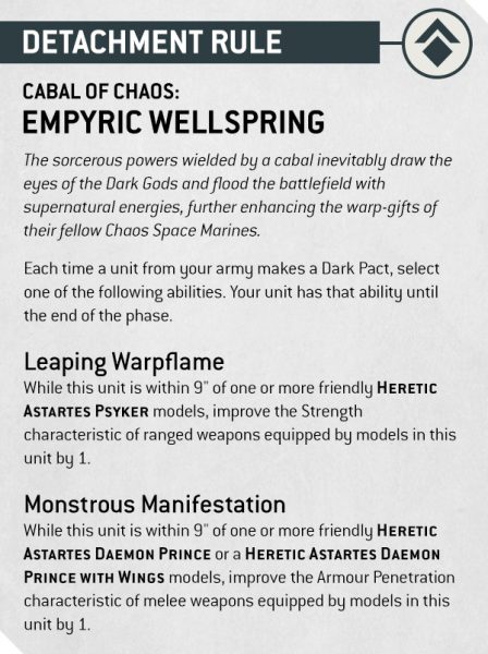 En primer lugar, los Marines Espaciales del Caos obtienen un nuevo Destacamento centrado en los poderes empíreos de sus Hechiceros, que interactúan con la regla de ejército de los Pactos Oscuros.