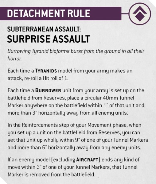 Los Mawloc y los Trygons excavadores ocupan el centro del escenario para el nuevo Destacamento Tiránidos mientras realizan ataques a través de túneles contra sus oponentes, abriendo nuevas avenidas para que el resto de las fuerzas de las flotas enjambre lleguen al campo de batalla.