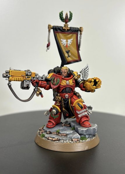 Y para finalizar…. vamonos a este personaje Angel Sangriento que con esos toques en amarillo en hombreras, puño de comnbate y bolter le dan un rico aspecto de «rojo soso y aburrido de siempre». Quizás para crear un capítulo sucesor de ellos podría ser un fácil esquema de color a conseguir.