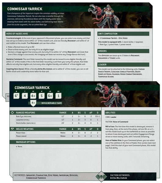 Décadas de batalla en las guerras más desesperadas imaginables le han otorgado un dominio de tácticas que pocos pueden igualar, y cuando lidera a sus Guardias Imperiales desde el frente, el Héroe de la Colmena de Hades puede convertir incluso a los reclutas más inexpertos en una fuerza de combate implacable.