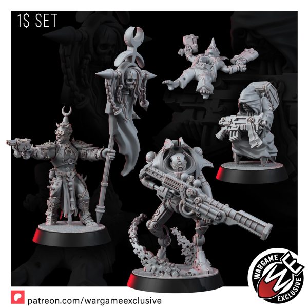 El pack esta compuesto por un Necrón con una poderosa arma, un cadaver gretching, un portaestandarte valido para la guardia renegada o para acólitos del Caos y un servidor de armas.