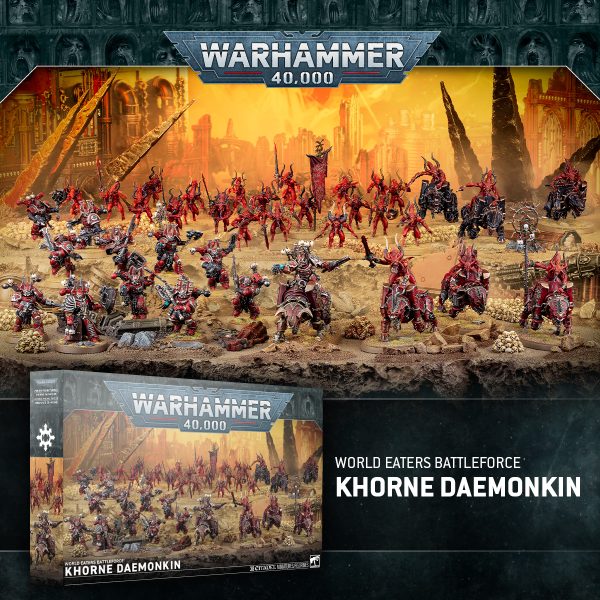La incorporación de Khorne a la nueva fuerza de batalla implica un interés más directo en la masacre con una fuerza combinada de mortales y demonios, provenientes de su reino infernal. La fuerza de batalla Daemonkin de Khorne está diseñada para ser utilizada con el Destacamento del mismo nombre y está liderada por un Señor en Juggernaut que carga al frente de seis Aplastadores de Sangre, todos montados en feroces corceles khornianos.
