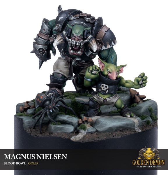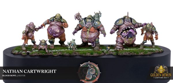 En segunda posición tenemos estos enormes bestias de Nurgle con luego algunos otros jugadores del Dios pútrido de menor indole y que en conjunto tienen un pintado magnífico dentro de lo que es la paleta de Nurgle. Y la peana muy bien conseguida ese trozito de campo de futbol. Creo que es la que más me gusta de las tres a mi personalmente.