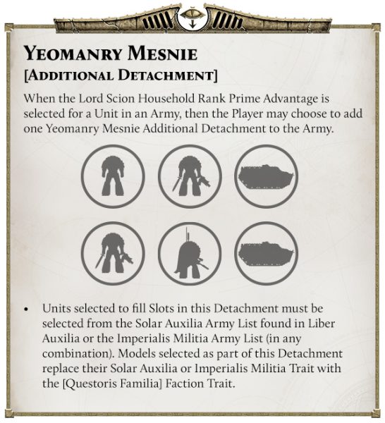Algunos rangos pueden desbloquear destacamentos únicos para el ejército. El Lord Scion puede acceder a la Yeomanry Mesnie , que permite llevar unidades de Auxiliares Solares. Es una forma brillante de añadir flexibilidad y singularidad a tus listas.
