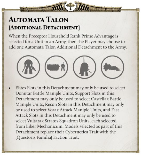 El segundo punto a destacar es que los Caballeros tienen un Destacamento Primario único que se usa en lugar del Destacamento Primario de la Cruzada. No permite Aliados, pero sí más opciones de Señores de la Guerra, y cada espacio es un espacio Principal, lo que permite a cada Caballero elegir una Ventaja Principal Única .
