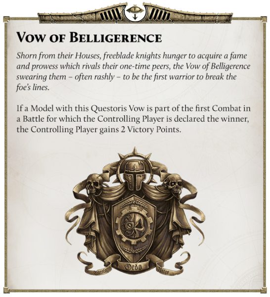 Los Caballeros de la Familia Questoris son un ejército pequeño y agresivo que se dedica a avanzar hacia objetivos controlados por el enemigo. Tanto los chasis Questoris como los Cerastus de Knight cuentan con la regla especial Vanguardia (X) , que les permite obtener puntos de victoria al destruir o derrotar a las unidades enemigas que controlan objetivos.