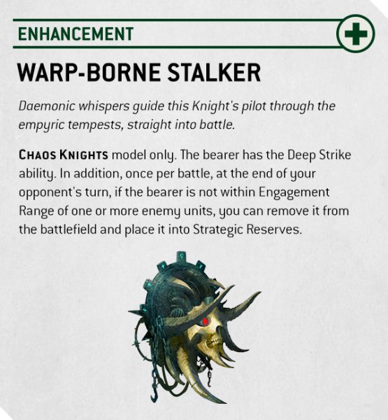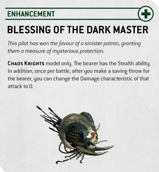 Todas sus Estratagemas están dirigidas a tus unidades de Personaje y, notablemente, incluyen más opciones de Mejora de lo habitual: seis, para ser precisos. Todas otorgan al Caballero una bonificación pasiva, como Acechador Transformado , que otorga Golpe Profundo, y cada una incluye una poderosa habilidad que se activa una vez por batalla. Si un ataque particularmente letal parece que va a eludir tu armadura, por ejemplo, la Bendición del Maestro Oscuro puede reducir ese Daño a cero.