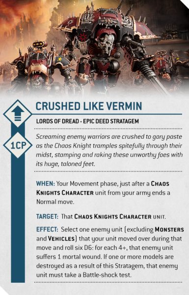 Para máxima arrogancia, ¿para qué molestarse siquiera en blandir tus armas contra la multitud que abunda ahí abajo cuando tienes pies en perfectas condiciones para aplastarlos? Un solo golpe de tus garras titánicas y serán aplastados como alimañas, para que puedas dedicarte a la importante tarea de dar caza a enemigos más dignos.