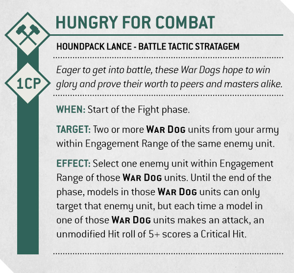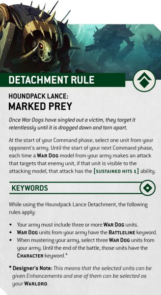 Si, por otro lado, no soportas la postura de la élite egoísta y quieres meterte en problemas con los Perros de Guerra, la Lanza de Manada de Perros te permite ignorar por completo a los grandes. Como las unidades de Perros de Guerra normalmente no tienen la palabra clave PERSONAJE , este Destacamento te permite elegir tres unidades para obtenerla, de modo que puedas mejorarlas con Mejoras y convertir a una en tu Señor de la Guerra.