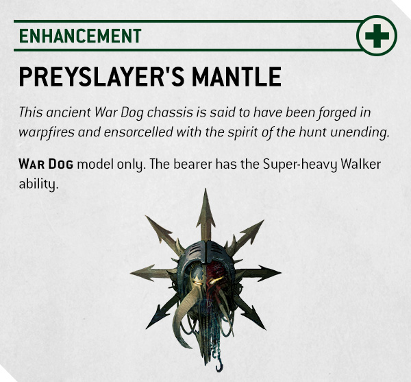 ¿Cuántos Perros de Guerra se pueden usar en una Lanza de Manada de Perros? Calculamos que unos 13, lo cual es mucho acero corrupto para que un enemigo lo contenga. Nos gusta especialmente una Mejora que otorga la regla de Caminante Superpesado, que puede aplastar a las unidades enemigas como si no estuvieran allí.