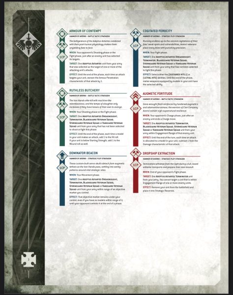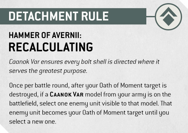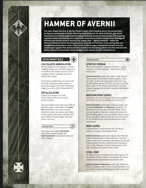 En contraste, Caanok Var y sus Manos de Hierro son un muro inamovible de guerreros veteranos, que imponen el Martillo de Avernii —una versión única del Destacamento de Fuerza Operativa de la 1.ª Compañía— con extremo prejuicio.