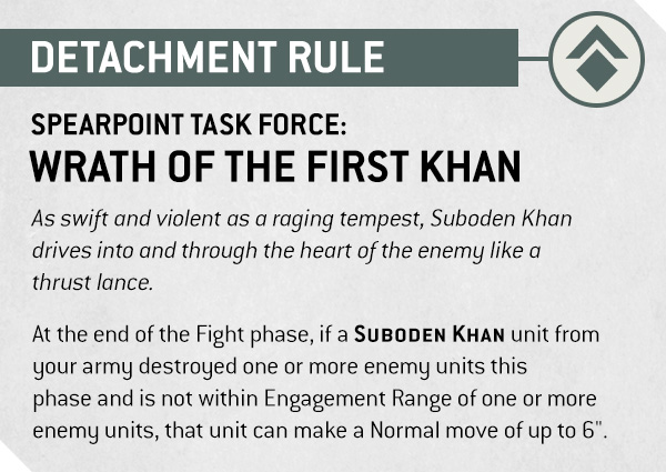 Además de esta habilidad, el propio Khan cuenta con una habilidad especial: la Ira del Primer Khan , que le otorga un impulso de velocidad al acabar con una unidad en la fase de Combate, permitiéndole atravesar el campo de batalla aún más rápido.