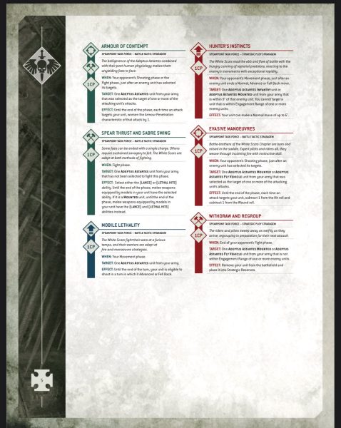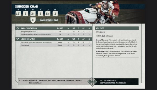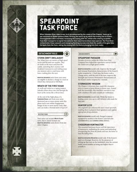 En primer lugar, los Cicatrices Blancas despliegan a sus veteranos junto a Suboden Khan como Fuerza Operativa de Punta de Lanza*, llevando la lucha directamente al corazón del enemigo con la habilidad de Cargar tras Retroceder o Avanzar, lo que les permite luchar con las mejores armas una y otra vez.