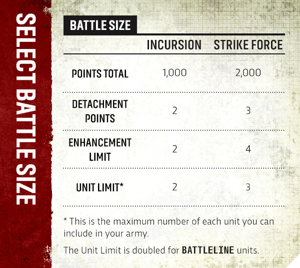 Dependiendo del tamaño de tu partida, podrás elegir varios Destacamentos en función de su coste en Puntos de Destacamento, que van desde 1 para aquellos con reglas más sencillas o que se centran en unidades específicas, hasta 3 para aquellos que afectan a todo tu ejército con mejoras significativas.