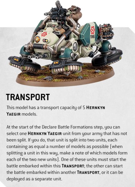 los Pioneros Hernkyn y los ATV Sagitaur . Este chasis adaptable se divide en dos unidades para apoyar las operaciones de Hernkyn de diversas maneras: pares de transportes Kapricus Carrier dividen un equipo de Yaegir Hernkyn entre ellos, mientras que los Defensores Kapricus despliegan una gran potencia de fuego en movimiento.