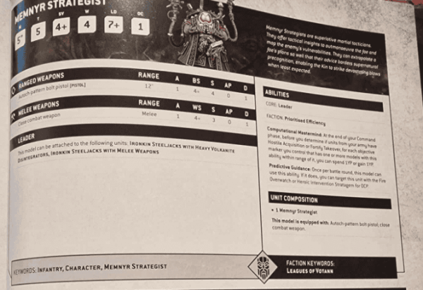 Los Estrategas de Memnyr son calculadoras andantes con un recuento de bajas. No solo predicen qué modo de eficiencia (Adquisición Hostil o Fortificar la Toma) tendrá tu ejército a continuación; generan Puntos de Defensa (PJ) simplemente permaneciendo cerca de los objetivos.