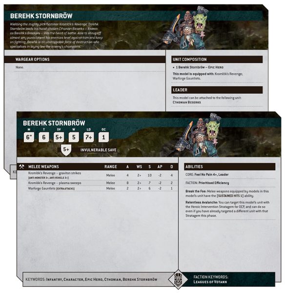 Berehk puede unirse a una unidad y los inspira a luchar con más ahínco en su presencia. Darles a los Beserks Cthonianos la habilidad [Golpes Sostenidos 1] provoca una masacre épica, y como sus mazos de conmoción también incluyen las reglas [Anti-Monstruo 3+] y [Antivehículo 3+] , a los Grandullones les disgusta verlos trabajar juntos.