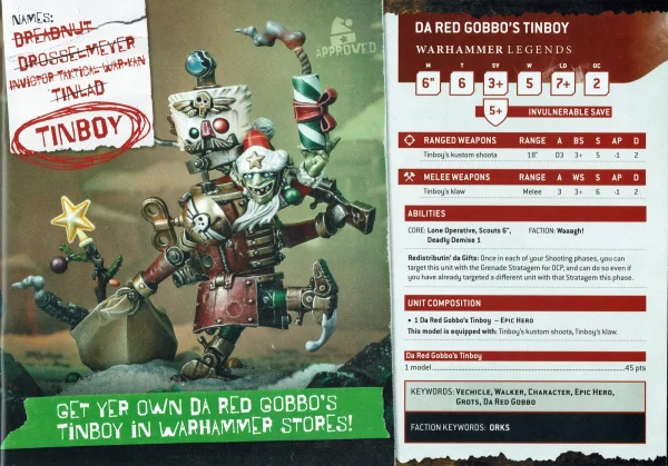 Bueno pues para ayudaros a usarlo, sus reglas están en el catálogo navideño de GW de este año pero sino pues os dejo una imagen que os da sus atributos, sus reglas especiales y su coste en puntos para que no tengáis ningun problema en incluirlo en tu ejército de Orkos en tu próxima partida.