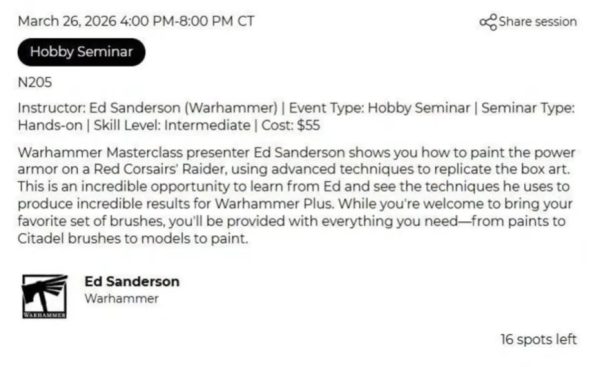 Se trata de un curso de pintura que dará en el evento Games Workshop y que dice que tendrán como avance el poder pintar un Corsario Rojo Raider.
