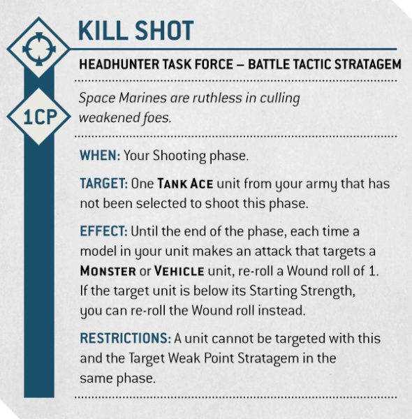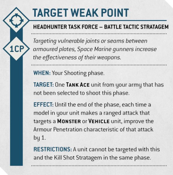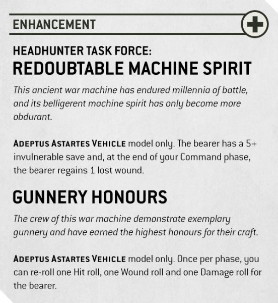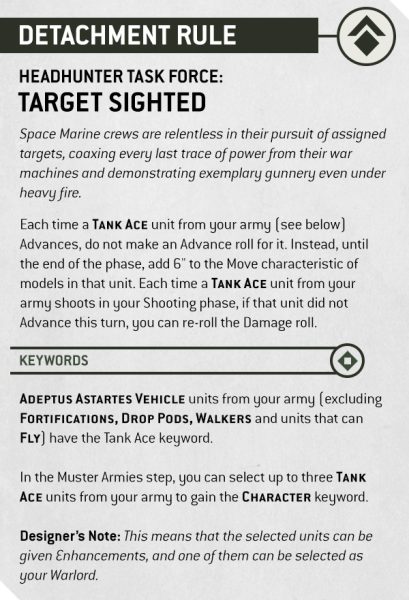 El Destacamento de la Fuerza de Tarea Cazadores de Cabezas reúne a varios de estos ASES DE TANQUES en una fuerza sumamente eficaz, capaz de moverse rápidamente por el campo de batalla o reducir la velocidad y concentrarse en la precisión con la regla Objetivo Avistado.