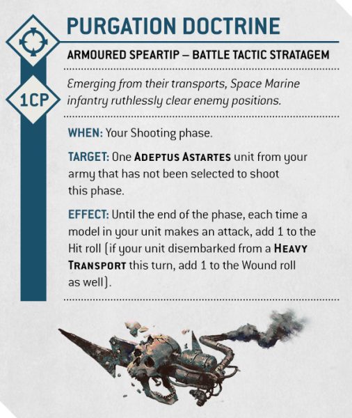 Furia de Máquina es una excelente manera de asegurar que la destrucción prematura de un vehículo no deje a tus mejores hombres en medio de una horda enemiga, y si tienen que abandonar el vehículo y participar en el combate, pueden causar estragos gracias a las bonificaciones de la Doctrina de Purificación a las tiradas para impactar y herir.