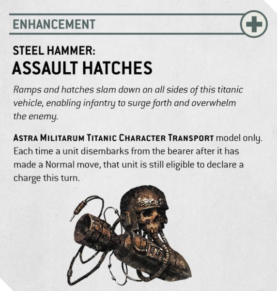 Puedes hacer de todo con tu nuevo señor de la guerra titánico, pero una de nuestras favoritas es la mejora de escotillas de asalto , que permite a la infantería desembarcada cargar incluso si su montura se ha movido. Imagínate: el general Stormlord atravesando de frente la línea defensiva enemiga, solo para que dos escuadrones completos de Bullgryns salgan a atacar su vulnerable flanco.