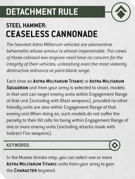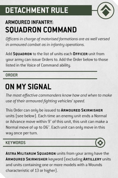La regla Destacamento también otorga a cualquier unidad de ESCUADRÓN más pequeña que un Leman Russ una nueva Orden, A mi señal , que les permite moverse rápidamente cuando el enemigo se acerca demasiado, ya sea para evitar su alcance o para perseguirlo.