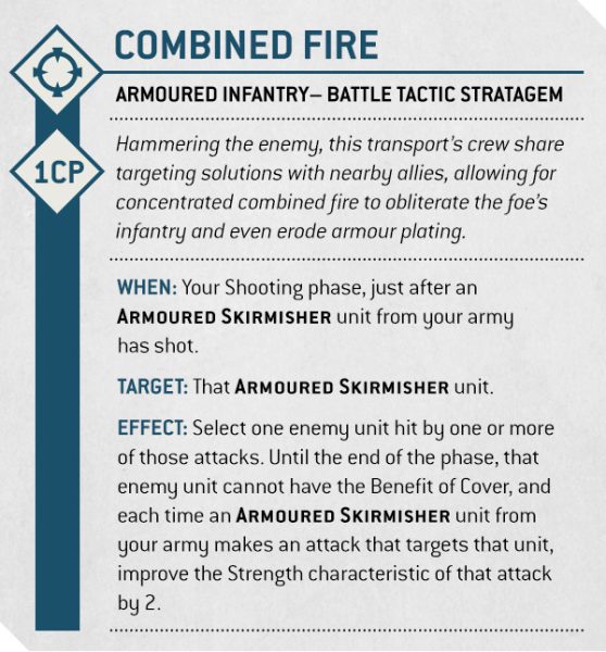 También son expertos en usar una potencia de fuego combinada abrumadora para derribar a los objetivos más resistentes, y un uso cuidadoso de la Estratagema de Fuego Combinado hará que incluso los rifles láser en la parte trasera de la Quimera hieren a los Marines Espaciales con un resultado de 3+.
