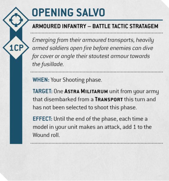 Tras desembarcar de su transporte, los Guardias Imperiales pueden lanzar potentes andanadas de fuego láser que sorprenden al enemigo, obteniendo una bonificación a las tiradas para herir mediante la Estratagema de Salva Inicial .