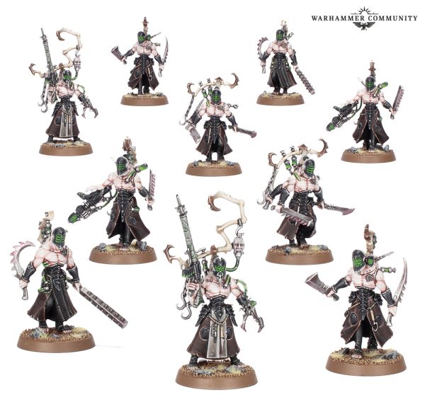 Aprendices de los Hemónculos y sujetos de prueba vivientes, los Wracks son abominaciones deformes con costuras, tendones y cicatrices. Empuñan armas crueles e inusuales que van desde cuchillas de carnicero hasta armas biológicas arcanas, cada una perfectamente ajustada para infligir la máxima agonía a sus enemigos. Esta caja contiene 10 Wracks, con diversas opciones que incluyen brazos, máscaras y piezas de espalda intercambiables.
