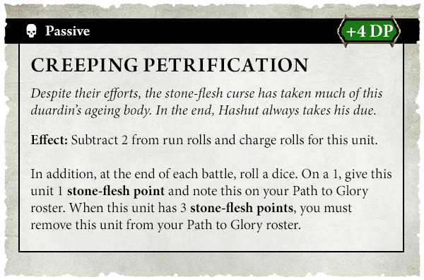 Sin embargo, estamos aquí para los defectos. Mantenemos la idea de dejar que los dados decidan nuestro destino, dándole a nuestro hechicero el defecto de Petrificación Reptante . Por el precio de restar 2 a las tiradas de correr y cargar, obtenemos un reembolso de cuatro puntos de destino y la posibilidad de convertirnos en piedra para siempre si tenemos mala suerte. ¡Ojalá Hashut nos vea con buenos ojos!