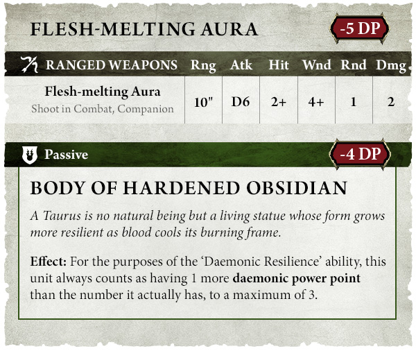 Cualquier líder de los Helsmiths que se precie podrá elegir entre las estatuas de Tauro que vigilan los zigurats, y podemos elegir entre un Tauro Infernal por 14 puntos de destino o un Tauro Venerable con más salud por 18. Nos conformaremos con el Tauro Infernal, que nos proporciona la Resiliencia Daemonic que se encuentra en la versión original del warscroll.