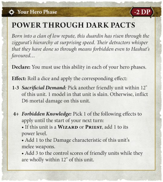 Ahora viene la parte divertida: tus orígenes y defectos. Puedes elegir uno de cada uno, y los defectos te devolverán puntos de destino. El Poder a través de Pactos Oscuros es una buena forma de aumentar temporalmente el poder de nuestro héroe, siempre y cuando podamos conseguir esas tiradas clave de 4+. De lo contrario, recibirá heridas o sacrificará una unidad cercana.