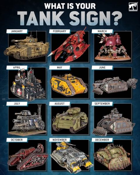 En esta ocasión lo que tenemos es 12 tanques de Warhammer 40000 que representan los meses del año para decirte, no se exactamente por el motivo fuera del azar que hayan escogido tanque por mes, el tanque que te corresponde por el mes de nacimiento.