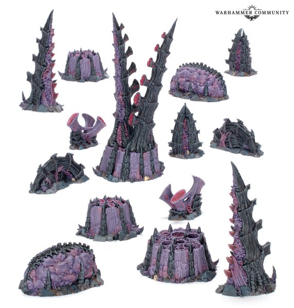 Este set contiene 15 piezas de escenografía dispersa, incluyendo dos sacos de gestación, dos crecimientos de lanzaesquirlas, dos torres capilares, dos nidos de cría, dos raíces capilares, dos respiraderos de esporas y una chimenea de esporas que puede apoyarse sobre un nido de cría para crear una estructura más grande.